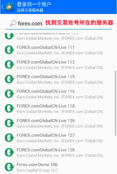 2、进入登录账户页面,在寻找交易商那里输入平台简称forex.com,选择MT4账户交易服务器名称(服务器请查看开通邮件或登录账户管理中心查看),然后输入MT4交易账户和交易密码,勾选“保存密码”,再点击登录。