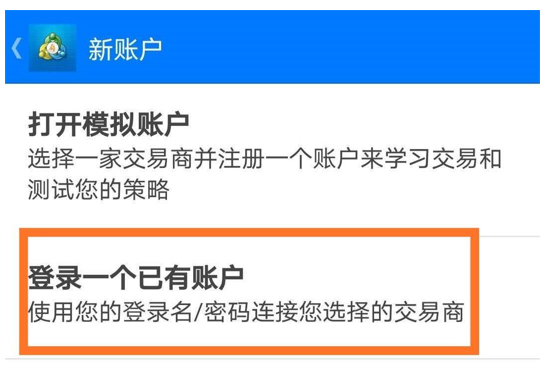 1、打开安装好的手机版MT4软件,点击左上角,再点击账户管理,再点击右上角“+”号,然后点击登录一个已有账户。