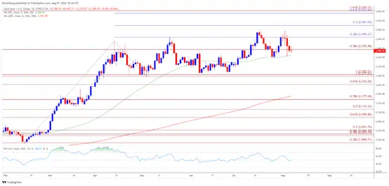 但跌势若不足以令价格收于50日均线(2369美元)以下可能会抑制金价近期的疲软,如果金价突破2450美元(38.2%斐波那契延伸位),则将冲击月内高点(2478美元)。