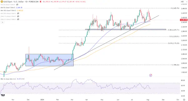 金价连续数日回落后已经回吐了上周的全部涨幅,目前正在考验趋势线和50天均线附近的支撑即2380一线。虽然RSI指标温和运行,但金价短线仍承受下行压力。若跌破上周低点2353后或确认双顶形态,后市恐延续弱势调整跌向2300整数关口。