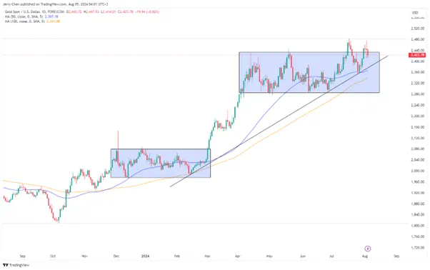 金价上周最高触及2477的历史次高点后回吐涨幅,周一早盘继续回撤,短线或考验2400整数关口,随后是趋势线和50天均线所在的2370/80区域。若能守住上述关键支撑,美元和美债收益率的下行有望对黄金形成利好。