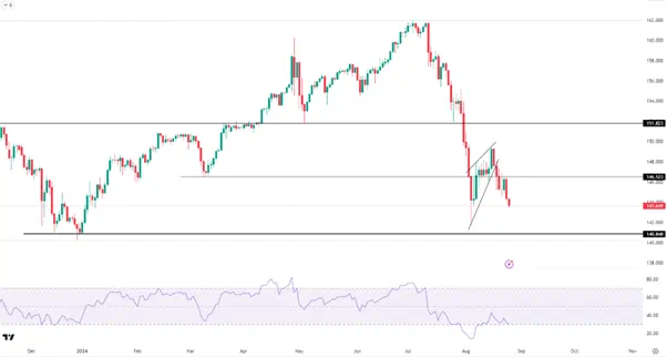 从日线图来看,经过短暂的反弹后,目前汇价阻力最小的方向毫无疑问是继续下行。前低141.70以及去年12月低点140.25是下方的主要目标,不过后者接近2021年以来上升趋势线所在的支撑,因此有望形成一定程度的止跌反弹行情。