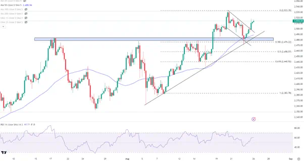 黄金在上周五收复了周四的全部跌幅,暂时避免了反转回落的形态,但在日线和周线级别仍存在明显的背离迹象。不过在美联储降息前景的带动下,金价在短线还是具有延续上涨的动能,潜在的地缘风险(以色列对黎巴嫩真主党发动空袭,后者随即展开反击)也是利多因素之一,尽管其作用可能不会持续太久。