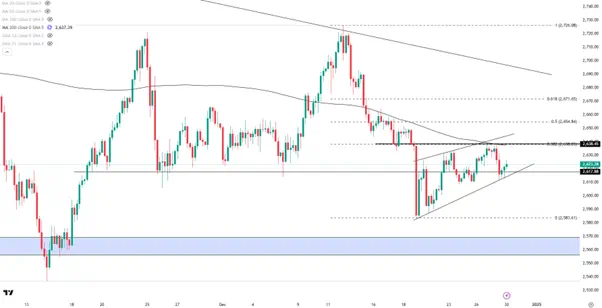 黄金上周的震荡上行在2638附近遭遇明显阻力,这里同时也是12月跌幅38.2%的回调位和200MA所在的区域,预计将继续成为金价在上方的重要压制。若无法顺利突破或延续震荡行情,下方首先关注调整通道下轨2618一线,跌破后恐再次下探前低2585以及2560附近的关键支撑。