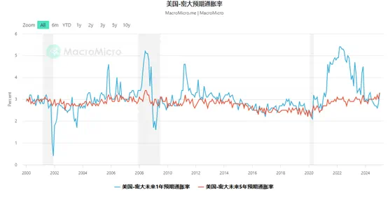 中长期来看,随着特朗普2.0的到来,其“对内减税并驱逐非法移民+对外高关税” 的政策组合拳有再次推升通胀的风险。最新公布的密歇根大学未来1年和5-10年的通胀预期均升至3.3%,后者更是创下2008年以来的最高水平。对于通胀升高的预期将促使企业和个人在高关税落地之前抢购和囤货,这可能使通胀在短期内难以下行。