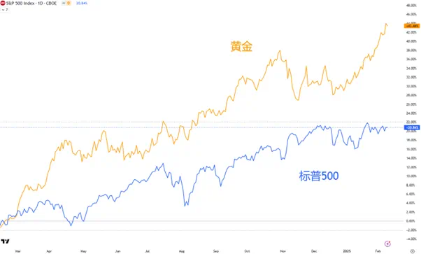 值得注意的是,过去12个月,金价累计上涨42%,标普500同期上涨20%(下图)。今年的涨幅对比为10%和3.5%。可见市场对黄金的定位并不仅仅局限于避险资产。中国的黄金ETF资产管理总规模在2024年翻了6倍,足以见得投资者的热情。