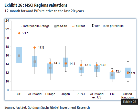 主要经济体股市的远期市盈率 来源:高盛,FactSet