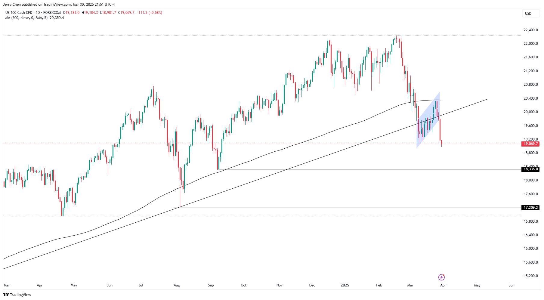 纳指过去两周的反弹未能重回关键的200天均线(或50周均线)上方,且再次跌穿长期趋势线的支撑,由此进一步明确了当前的下行走势。经济数据以及关税政策都无法提振低迷的市场情绪。