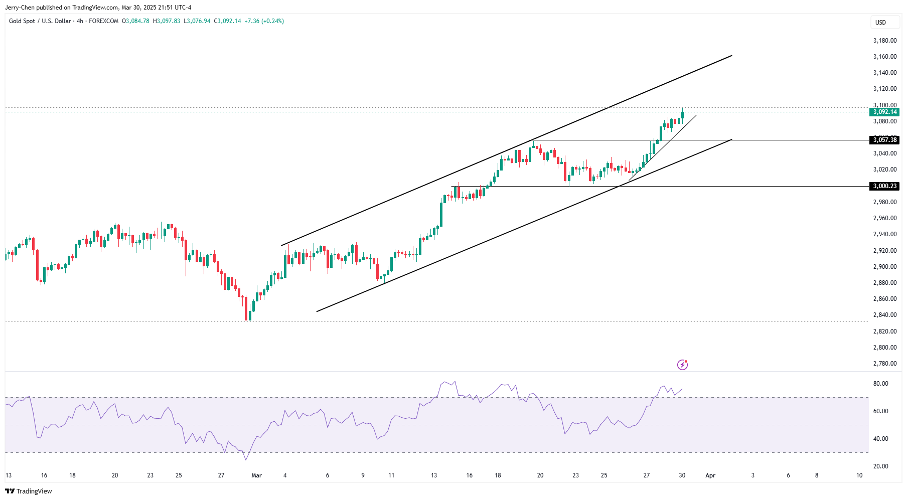 一旦本周特朗普对等关税的破环程度不及预期,金价可能会对日线及以上周期的超买行情展开修正,或重回3000-3056这一震荡区间。
